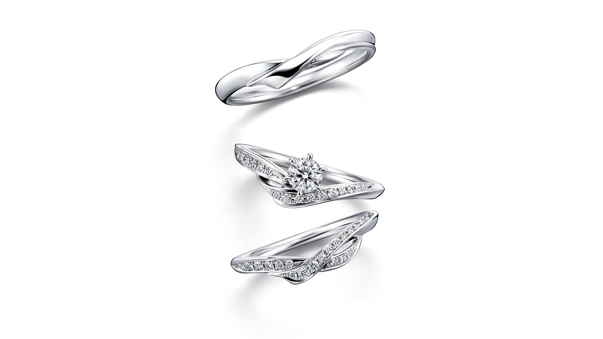 两只戒指重迭的华丽分量感、左右相反的交错线条迭合等, 建构出这款套戒独有的精致比例。 订婚钻戒的主钻落在结婚对戒的V型线条中央, 更加突显不对称的设计。