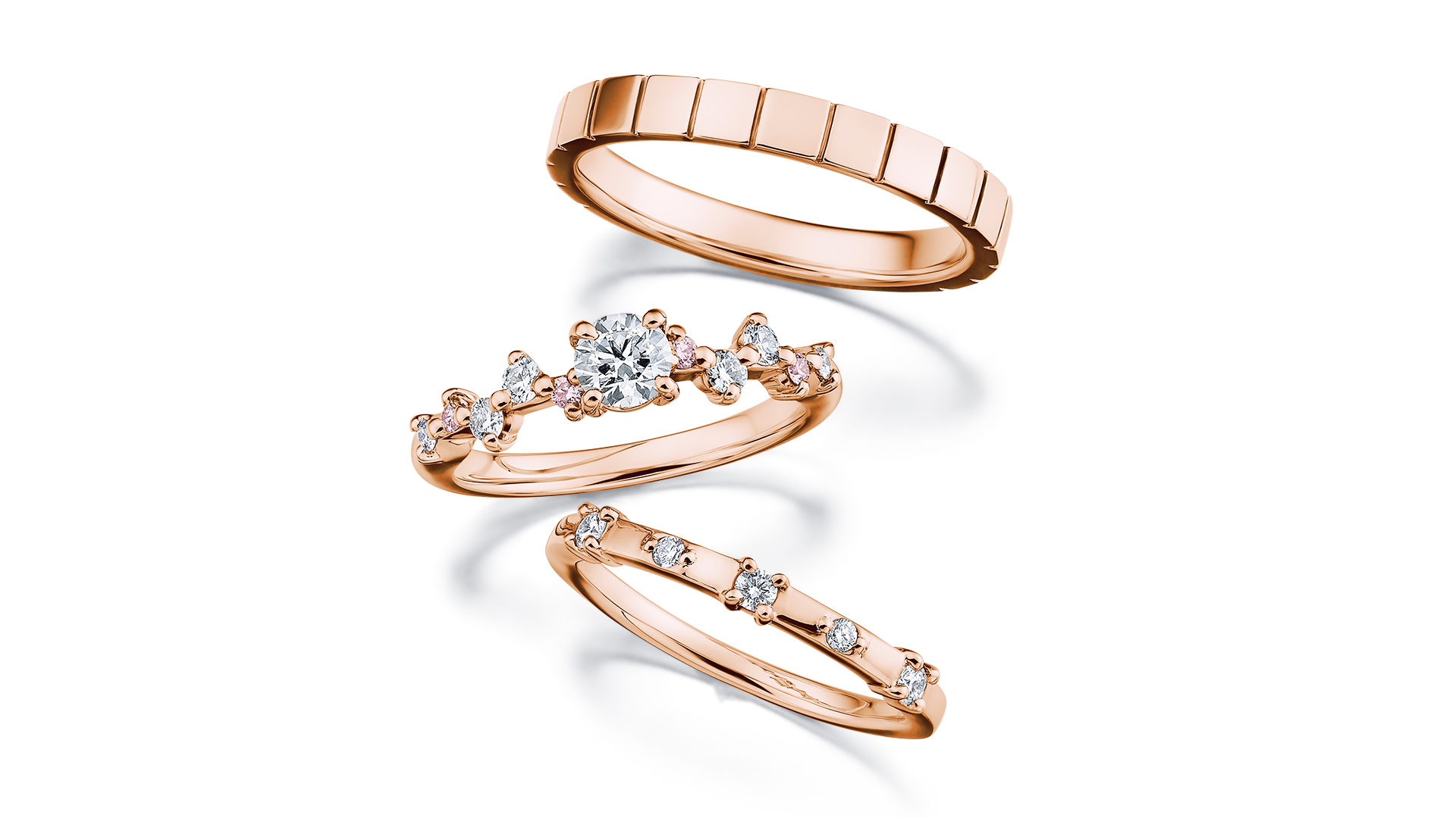 订婚钻戒以花环造型在指间甜蜜闪烁。 结婚对戒以果树之花的守护神为灵感,缔结情缘,开花结果。 ※粉红钻石为天然形成的矿石,图片颜色仅供参考,详细请洽各店铺服务人员。