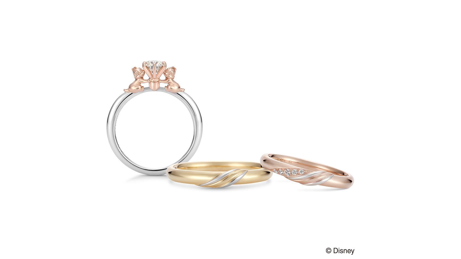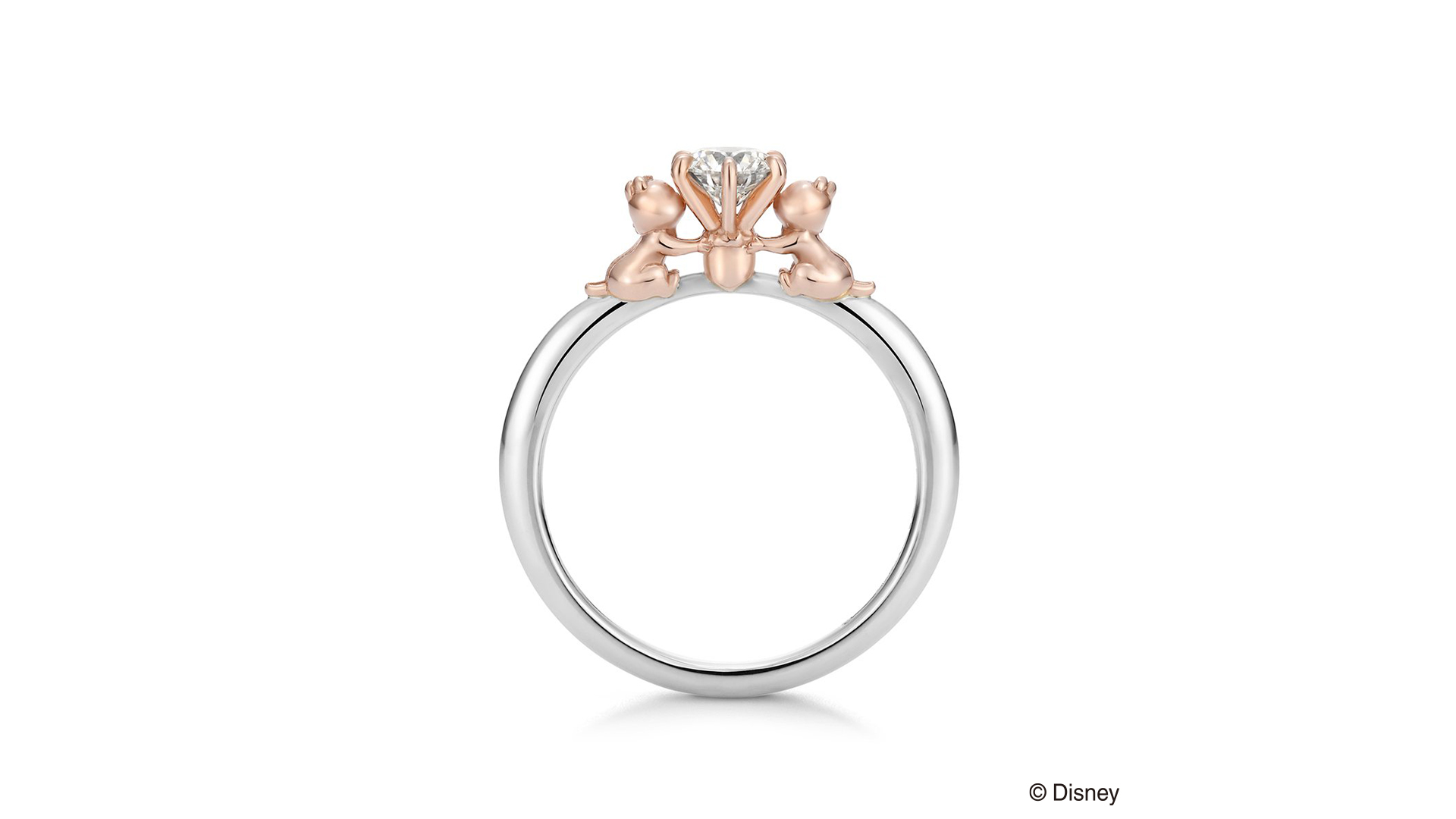 以团队合作极佳的顽皮组合“奇奇蒂蒂”为主题,脸部细致刻划展开笑颜,仿佛祝福着充满无限光辉的未来。戒台特别设计成“奇奇蒂蒂”最爱的橡果,突显两伙伴小心翼翼将钻石捧于手心的可爱模样。