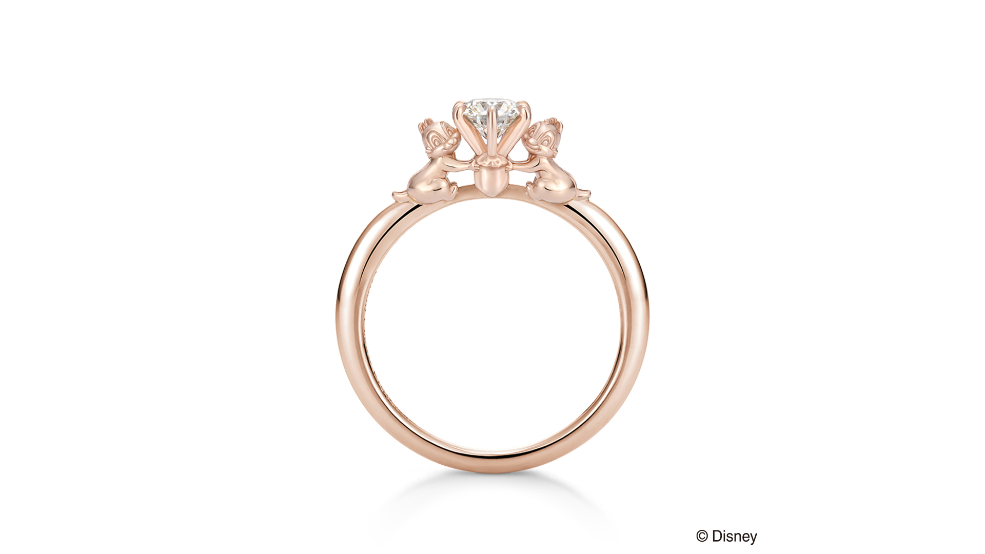 以团队合作极佳的顽皮组合“奇奇蒂蒂”为主题,脸部细致刻划展开笑颜,仿佛祝福着充满无限光辉的未来。戒台特别设计成“奇奇蒂蒂”最爱的橡果,突显两伙伴小心翼翼将钻石捧于手心的可爱模样。