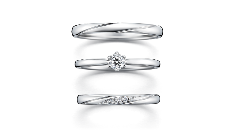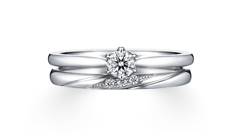 订婚钻戒的单颗钻石一如向日葵的命名,彷彿偌大的花朵甜美闪烁。结婚对戒的配钻线条优雅迷人,象征真诚的爱之轨迹。由两者和谐叠搭的结婚套戒,让指间散发璀璨光芒。