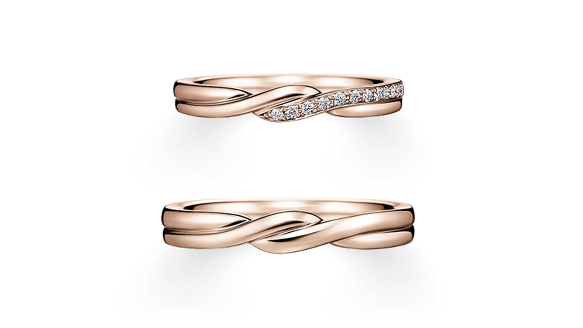 配钻与黄金线条互相交错的戒指,赋予指间优美魅力; 戒指厚实有分量,展现不容忽视的存在感。 直线型戒环上令人印象深刻的扭转造型与双色设计, 在手上散发高雅气质,祝福展开新生活的两人。