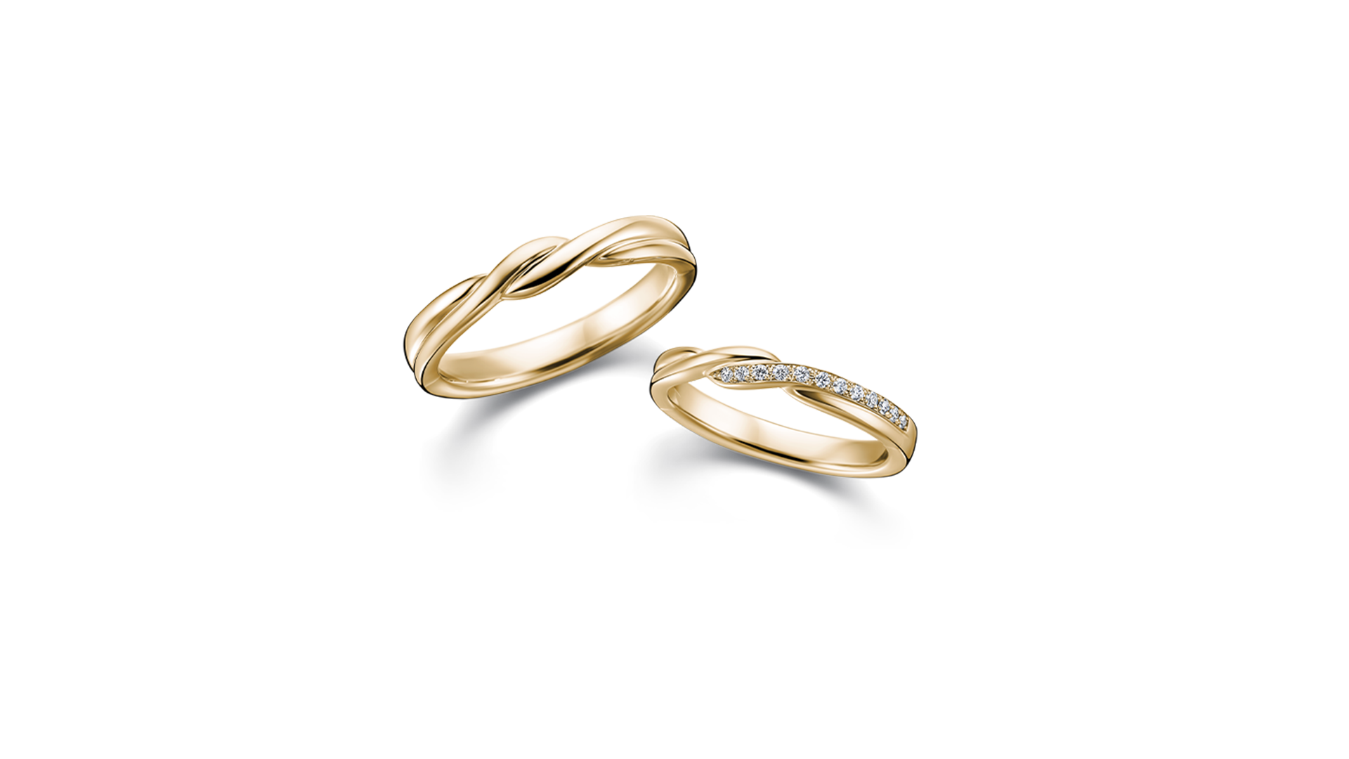 配钻与黄金线条互相交错的戒指,赋予指间优美魅力; 戒指厚实有分量,展现不容忽视的存在感。 直线型戒环上令人印象深刻的扭转造型与双色设计, 在手上散发高雅气质,祝福展开新生活的两人。