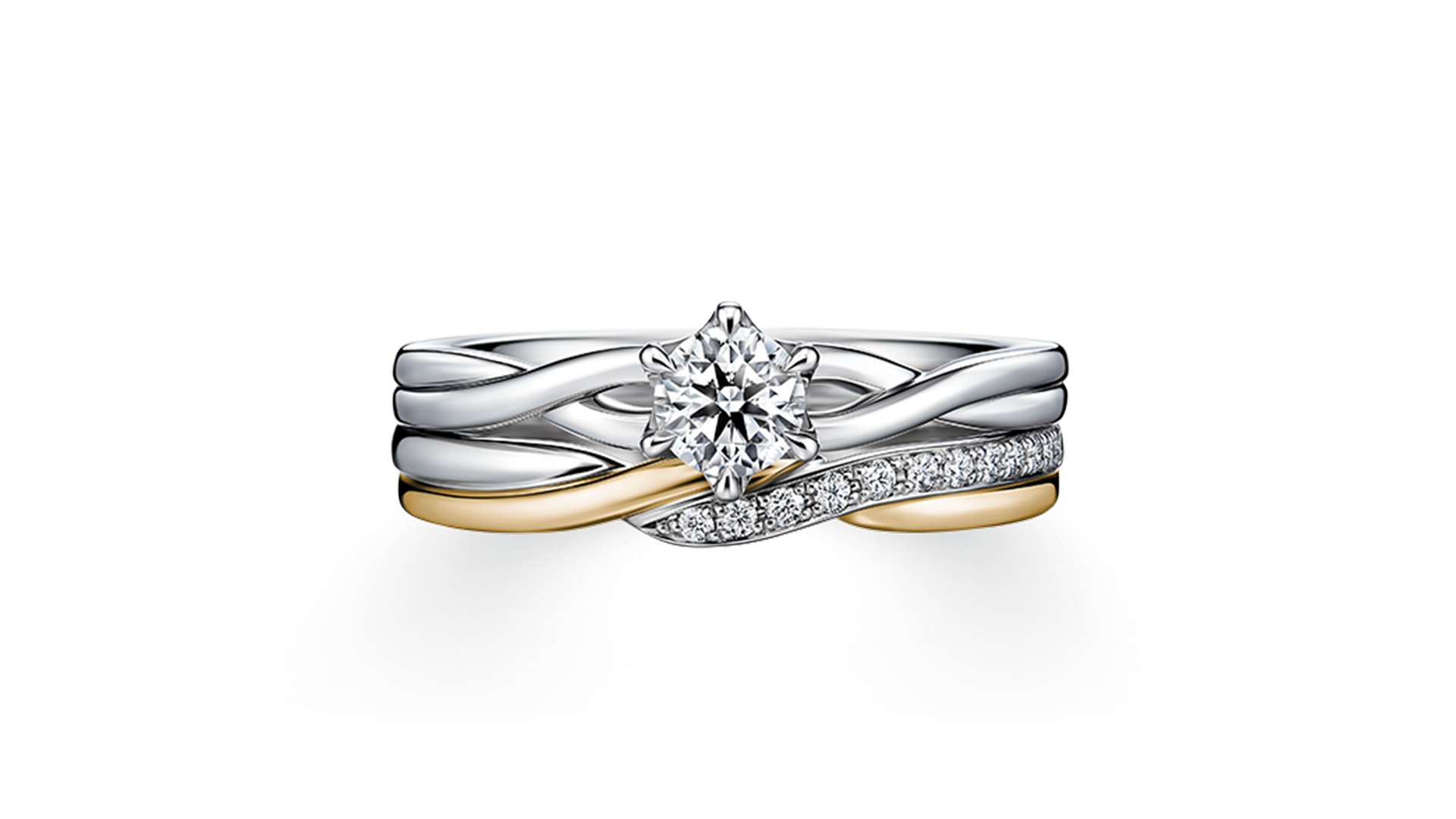 套戒为两只直线型戒环搭配波浪设计的戒指,散发洗炼风格。黄金与配钻的交错线条令人印象深刻,创造出不对称的美丽流线。 成套佩戴时更具立体感与分量感,充满魅力。