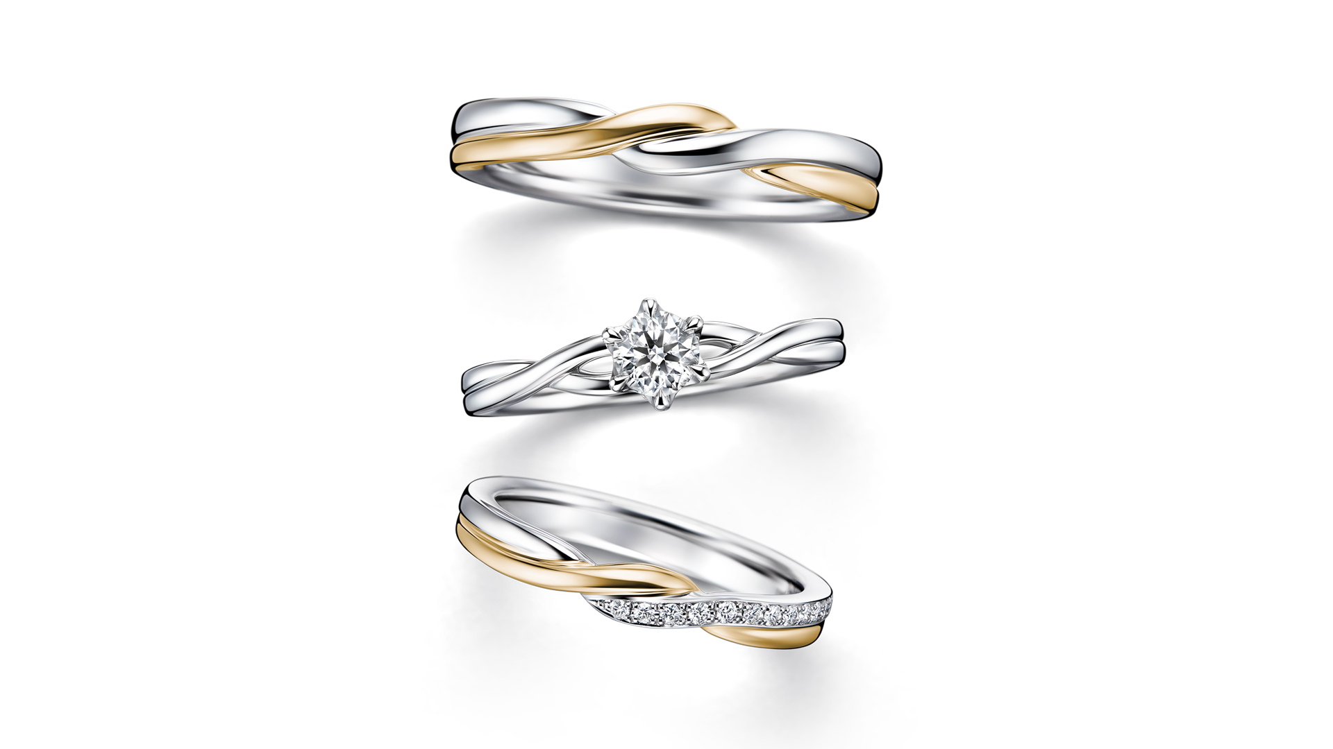 三款线条各异的戒指,以细致的扭转造型交织而成,宛如推动帆船的风,形成设计洗炼亮眼、风格华丽的套戒。