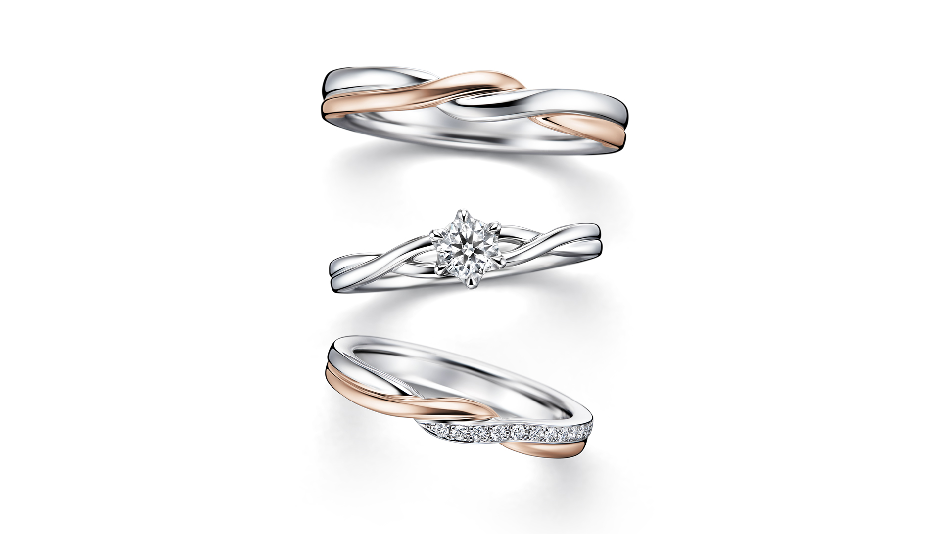 三款线条各异的戒指,以细致的扭转造型交织而成,宛如推动帆船的风,形成设计洗炼亮眼、风格华丽的套戒。