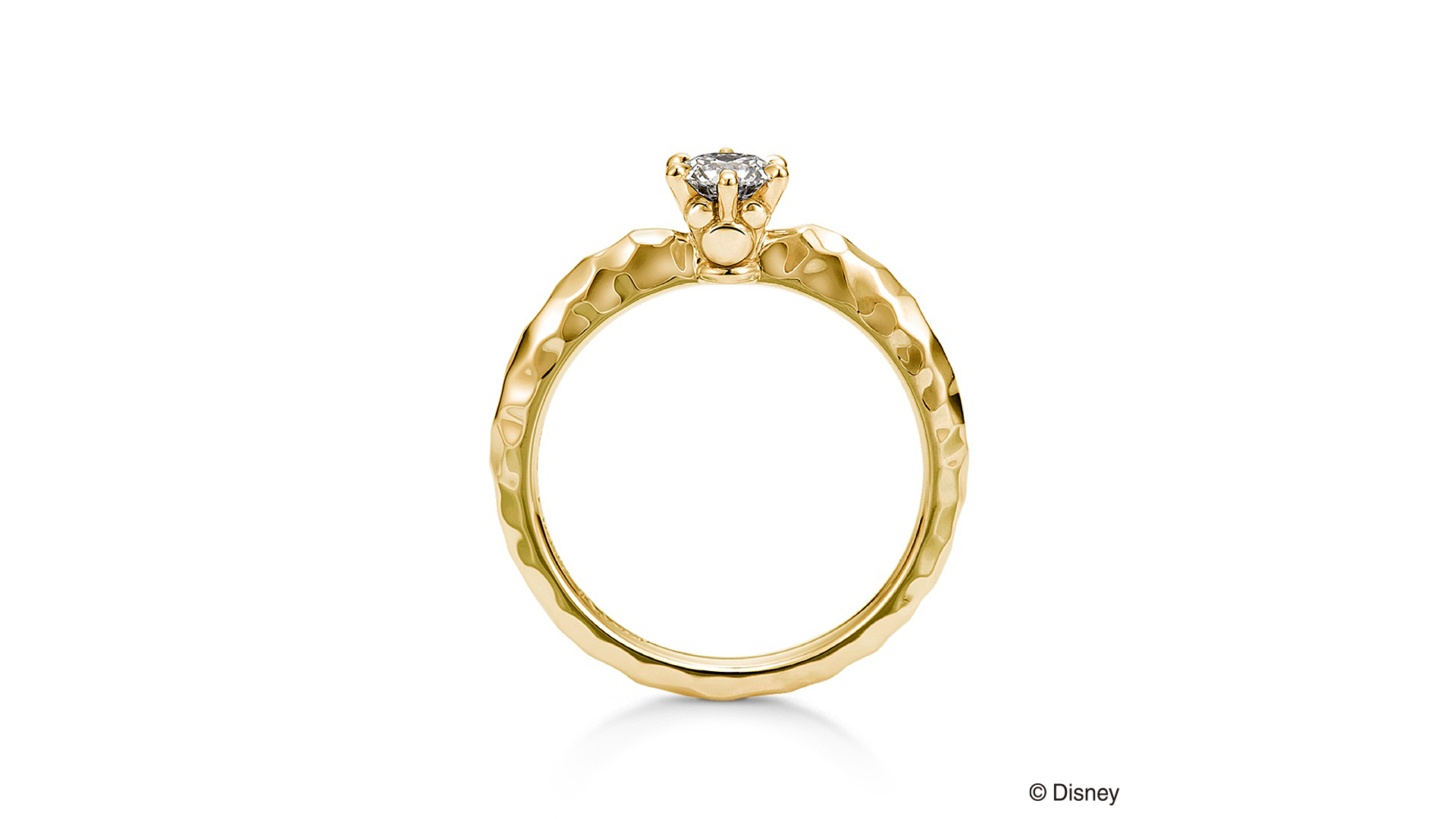 单钻型订婚钻戒是一直以来备受青睐的经典造型。通过精心设计,让您与喜爱的角色永远在一起。表面刻满锤纹图样,不着痕迹地展现个性魅力。支撑钻石的座台暗藏“米奇”的轮廓,让人不禁会心一笑。