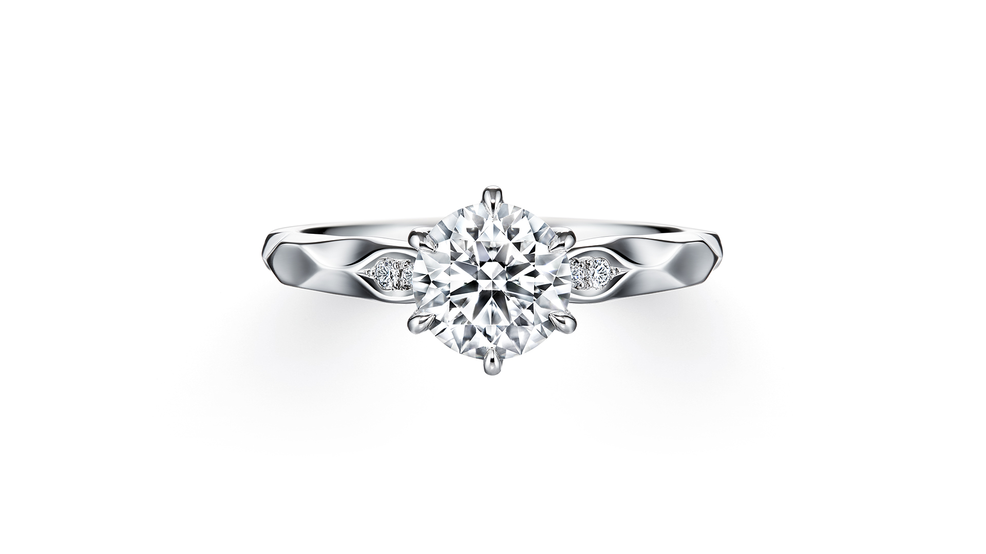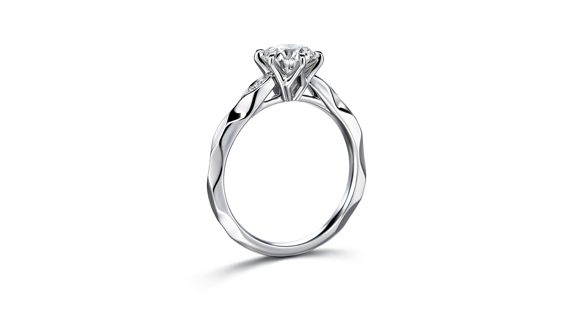以描述优美涟漪的季语为主题,为纤细戒环赋予具生命力的纹理。 点缀侧视角度的菱形空间也会照入光线,使钻石绽放细致光芒。 宛如阳光下闪耀的河流,献给珍惜安稳幸福时光的两人。