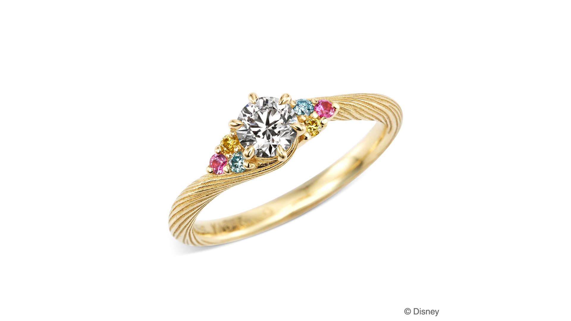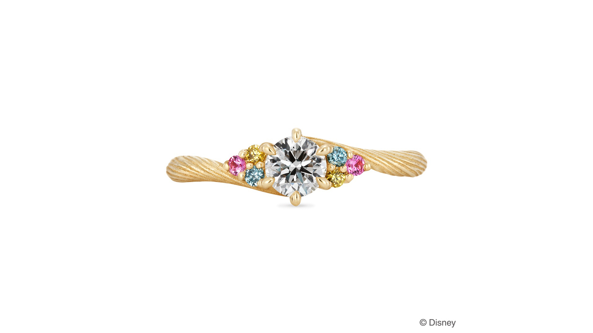 以发丝为主题,设计出美丽的细腻质感。3种宝石色调令人联想到电影的情境,且让手指倍显华丽。钻石下方的戒指内侧另刻有太阳图纹。
