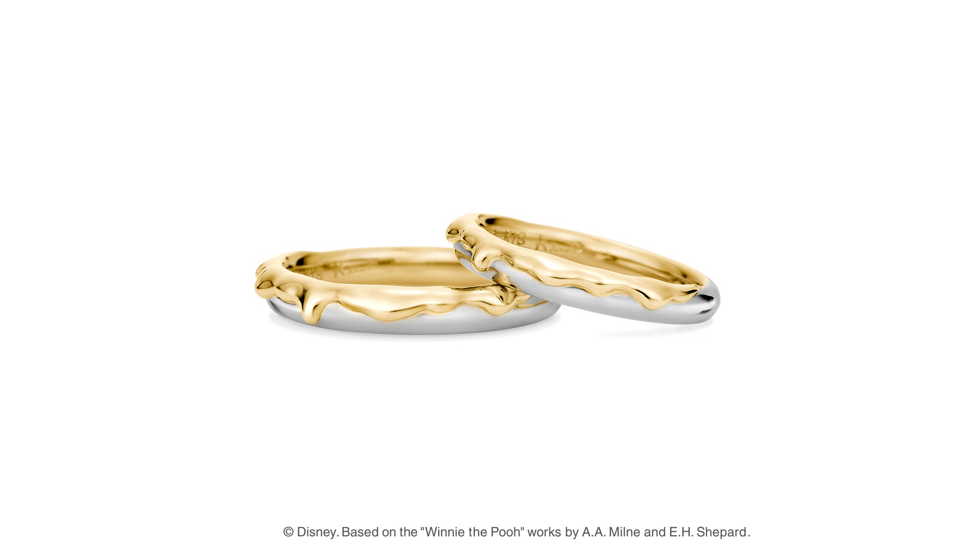 将“小熊维尼”最爱的蜂蜜融化模样,设计为结婚对戒。覆盖于戒指上的是代表「可爱之人」的「Sweet Honey」,当中蕴含着希望两人永远融洽甜蜜的心愿。