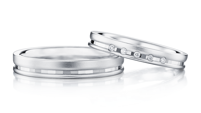 十分符合其创造神之名的个性化设计。于雾面戒环不对称地搭配镜面切割,其独特光芒是很大的特色。镶有5颗配钻的女戒更显奢华耀眼。