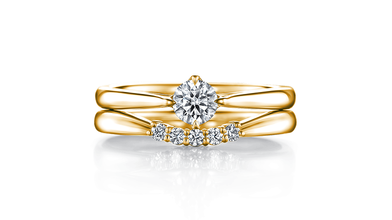 宛如一等星般光彩夺目的主钻,在五颗配钻绕成的可爱曲线衬托之下,使套戒更显华丽璀璨。设计精致洗炼,散发纯洁光辉。