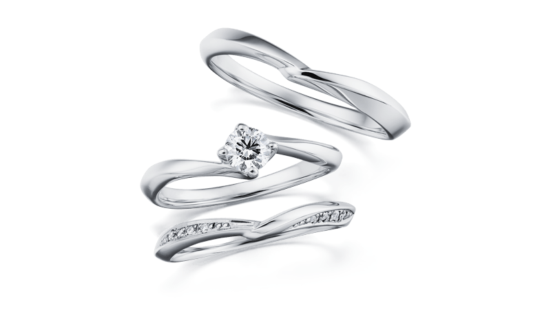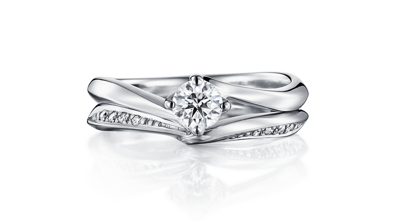 线条优美的戒环与外缘稜角设计的波浪型结婚对戒搭配成套。订婚钻戒的主钻夺目绚丽,搭配简洁的结婚对戒,更显奢华。