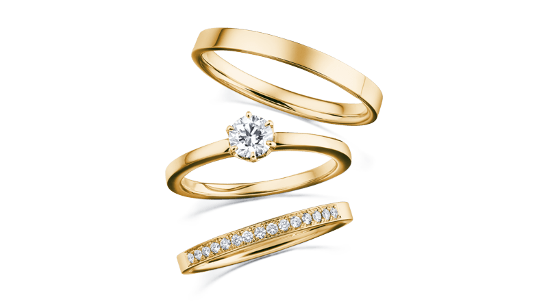 订婚钻戒展现隐藏于纤细中的坚强;结婚对戒带给人简洁却华丽的印象。适合成熟大人佩戴的简约时尚组合。
