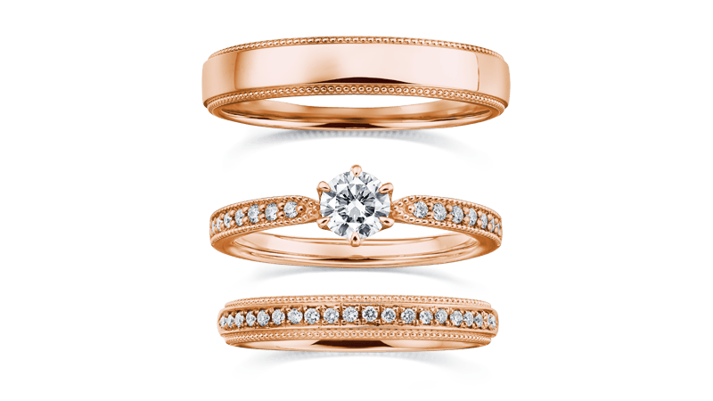 高雅的古董风设计,细緻的密钉镶滚珠边和闪亮的配钻为其特色。环绕整圈的美丽滚边,象徵两人永恒不变的约定。
