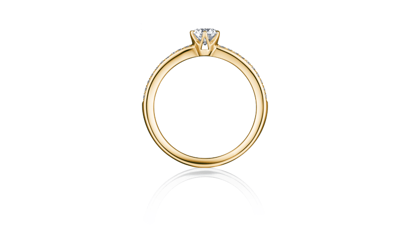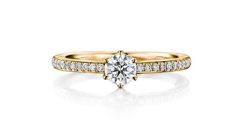 小巧戒爪所镶嵌的配钻绽放美丽光芒,是款散发高雅华丽感的订婚钻戒。