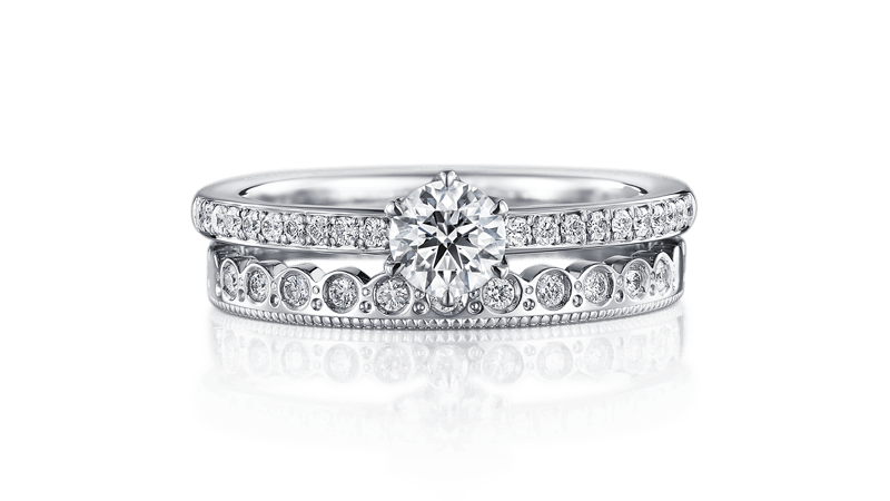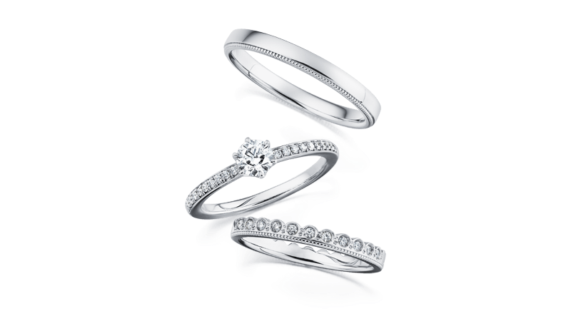 高雅耀眼的订婚钻戒『CORONARE』与浪漫可爱的结婚对戒『ARIADNE』搭配成对,华丽闪耀幸福光芒。