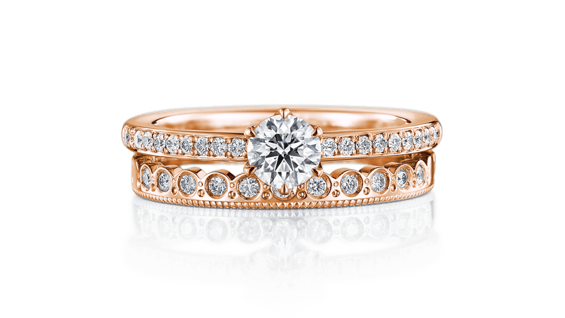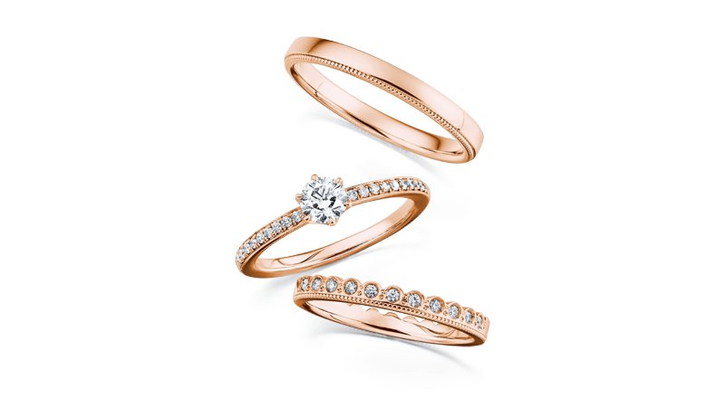 高雅耀眼的订婚钻戒『CORONARE』与浪漫可爱的结婚对戒『ARIADNE』搭配成对,华丽闪耀幸福光芒。