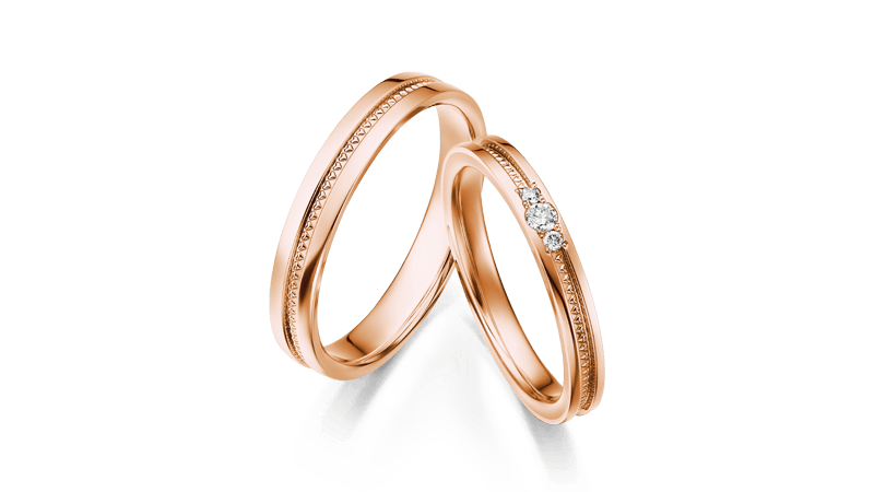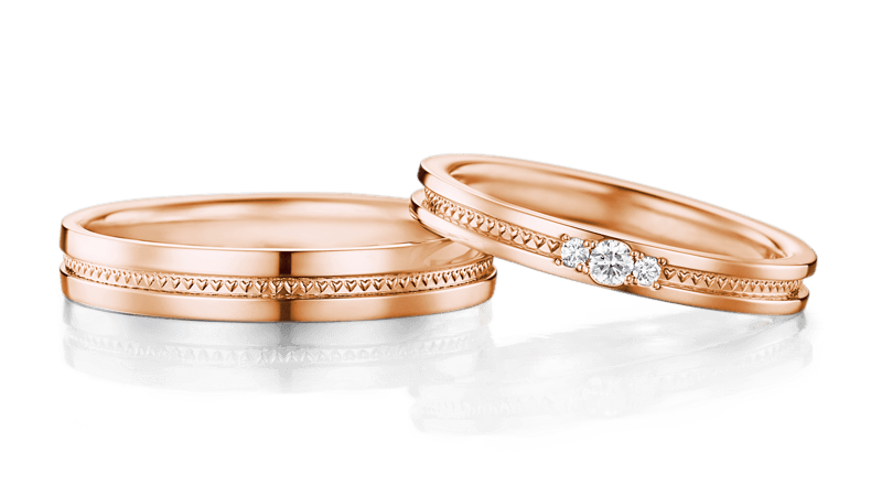 订婚钻戒的心型戒台,与结婚对戒的心型密钉镶滚珠边相连结。结婚对戒上绵延不绝的心型滚边,象徵永恒的爱恋。
