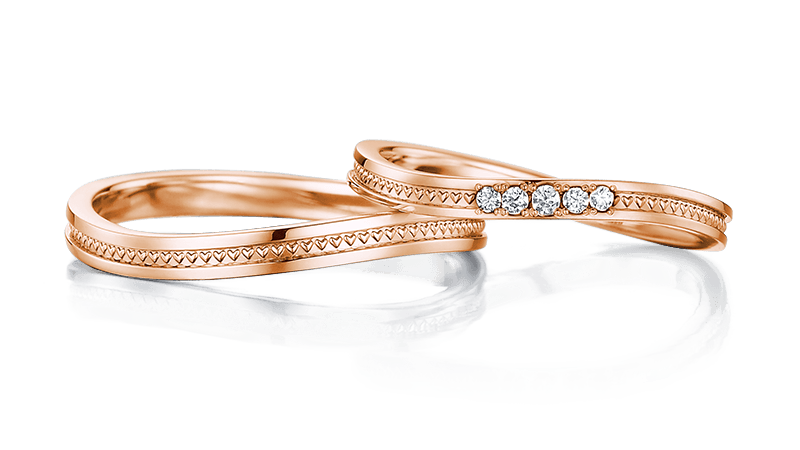 以心型密钉镶滚边做出连续不断的曲线型结婚对戒。