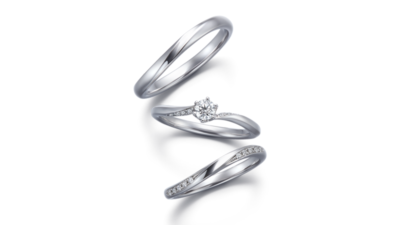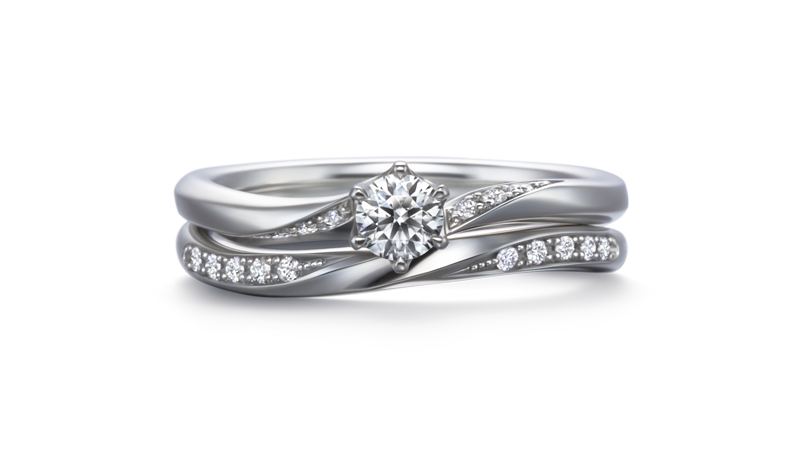 有如光线照射在心灵,如命运般的相遇。代表祝福之花的订婚钻戒与结婚对戒重迭配戴,描绘出相遇的瞬间。两只戒指合并时,以配钻形成连绵而优美波浪线条,为此套戒的特点。使爱的约誓一直伴随左右。