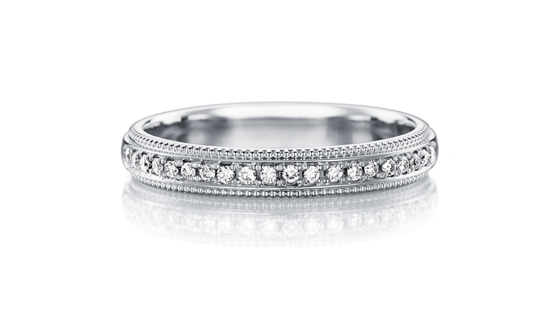 环绕戒环整圈的密钉镶象徵著「永远」,古典雅致的设计风格,非常适合做为象徵誓言的戒指。