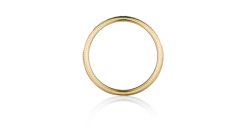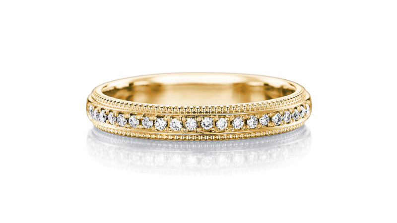 环绕戒环整圈的密钉镶象徵著「永远」,古典雅致的设计风格,非常适合做为象徵誓言的戒指。