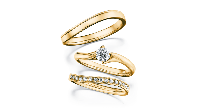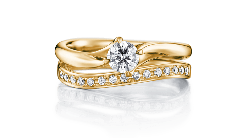 以铺满碎钻的线条展现奢华感的結婚戒指「TRITONE」,搭配设计简洁的订婚戒指,给人成熟的印象。是组闪耀着时尚光芒的套戒。