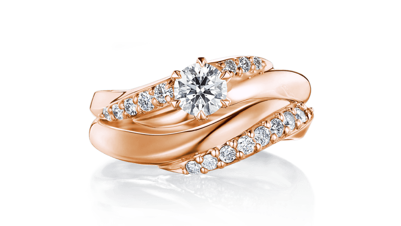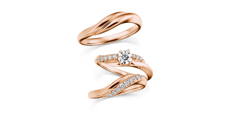 优雅S字型线条戒环的订婚钻戒与以同样波浪造型设计的结婚对戒。单独佩戴镶有丰富配钻的戒指显得高雅;成套佩戴时更显奢华风格。