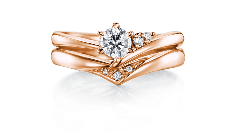 V字戒环的订婚钻戒与结婚对戒让手指更加修长优雅。两只戒指的中央钻石排成纵线,更增添令人印象深刻的光芒。