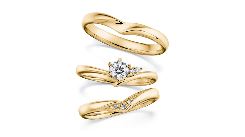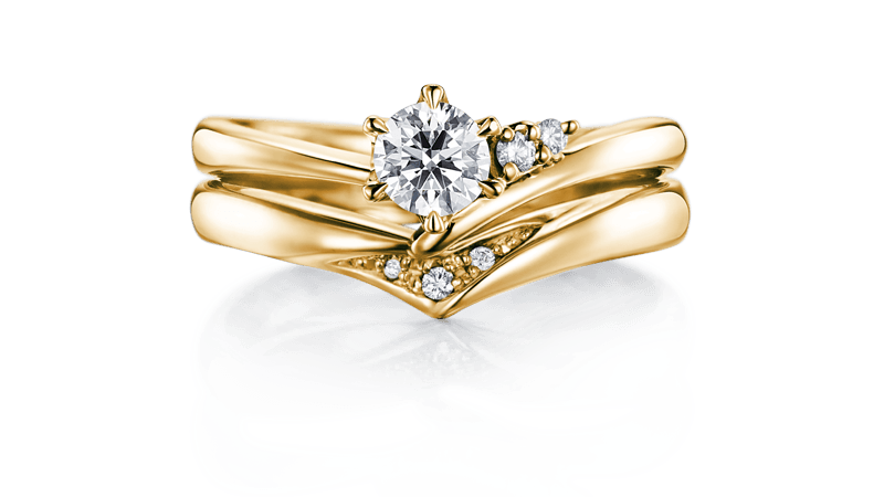 V字戒环的订婚钻戒与结婚对戒让手指更加修长优雅。两只戒指的中央钻石排成纵线,更增添令人印象深刻的光芒。