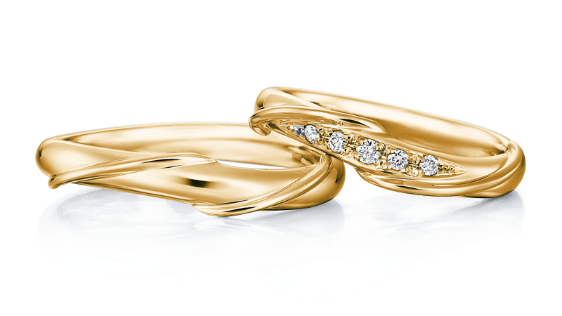 细窄的戒环上大胆地添加扭转线条,呈现出适当份量与存在感。女性款戒指是玫瑰金跟铂金的变色组合,并于中央配置配钻展现华丽感。
