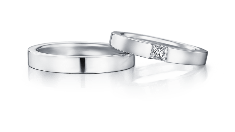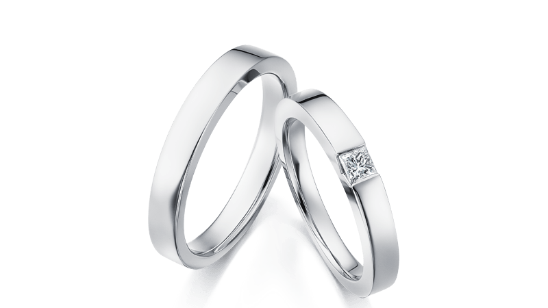 质感坚实的个性对戒。中央的公主型车工钻石给人时尚的印象。