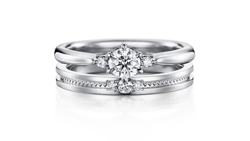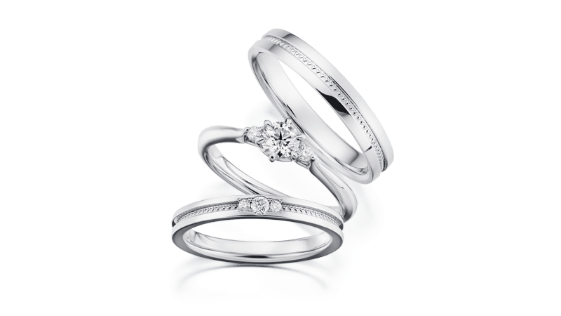 订婚钻戒的心型戒台,与结婚对戒的心型密钉镶滚珠边相连结。结婚对戒上绵延不绝的心型滚边,象徵永恒的爱恋。