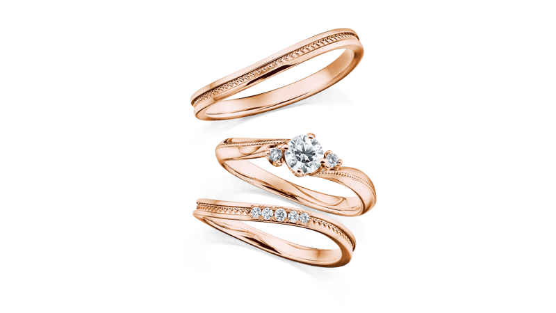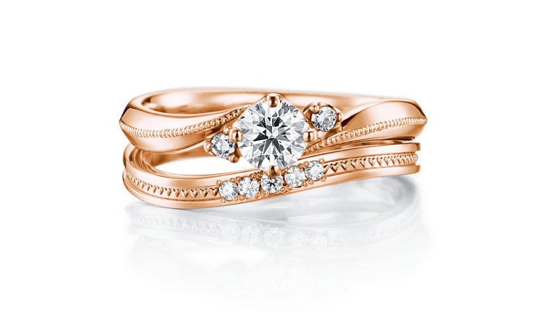 细致的心型密钉镶滚边闪亮耀眼的结婚套戒。订婚钻戒和结婚对戒的线条结合,可爱地依偎在主钻旁的配钻,让手指显得更加美丽。