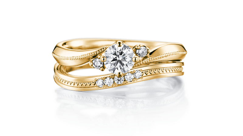 细致的心型密钉镶滚边闪亮耀眼的结婚套戒。订婚钻戒和结婚对戒的线条结合,可爱地依偎在主钻旁的配钻,让手指显得更加美丽。