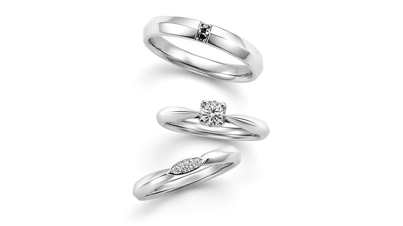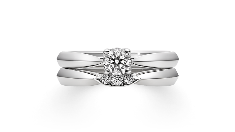 中央主钻給人深刻印象的订婚戒指和可爱设计結婚戒指的組合,配戴时能展現华丽风情,闪耀钻石印象感光芒的结婚套戒。