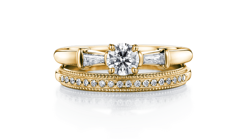 订婚钻戒的黄金密钉镶边象徵著太阳,唯美浪漫,与带有蝴蝶结设计的订婚钻戒结合。古典中闪耀著甜美时尚。
