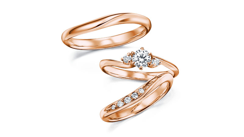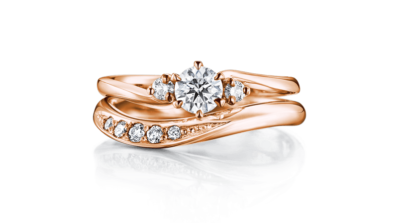 订婚戒指两旁的配钻象征两人的现在和过去,主钻则代表璀璨的未来。搭配简洁柔美线条的结婚戒指,提升整体高雅气息。