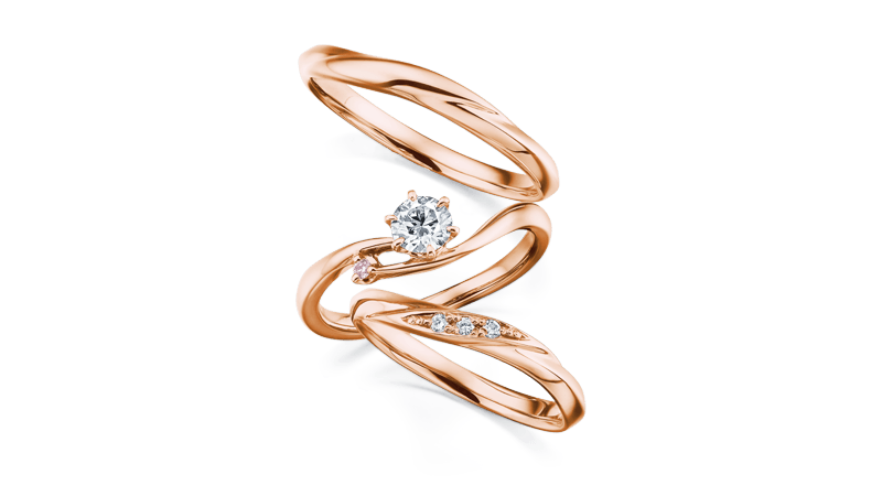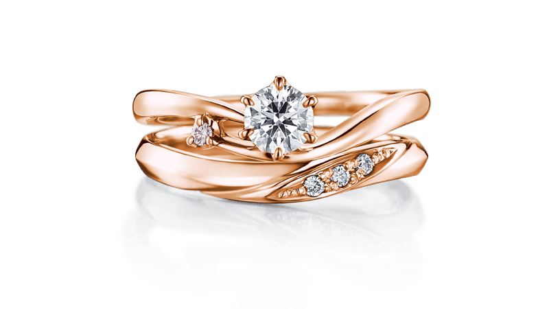 相当受欢迎的不对称设计款订婚钻戒。戒环上刻画轻柔线条的结婚戒指。重叠佩戴,在你的指尖上凝聚闪亮光采。