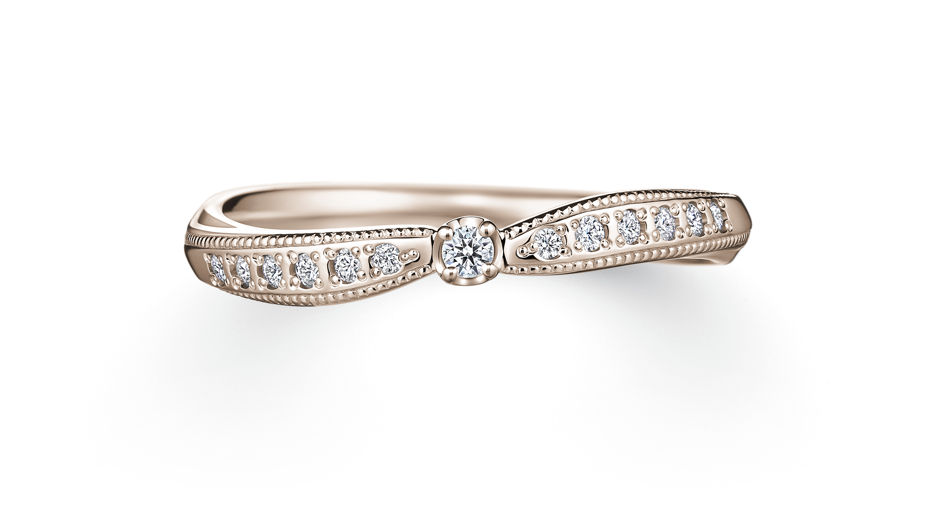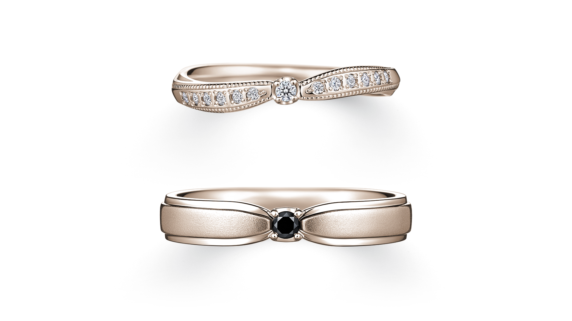 这款结婚对戒的设计概念是边缘仿佛镶着星辰的缎带。13颗配钻搭配滚珠边的双金戒指显得可爱甜美。低调的波浪线条能修饰手指,不仅华丽,更散发温柔的氛围。