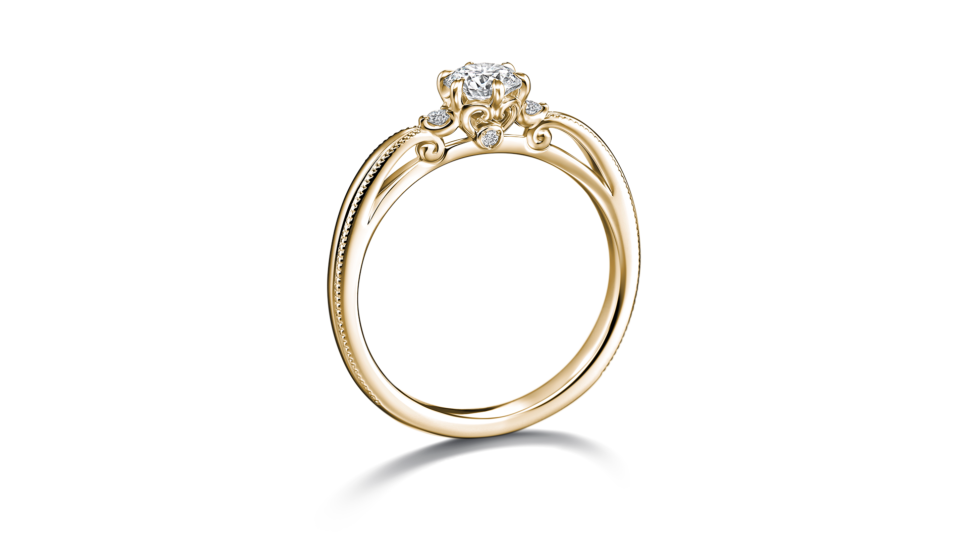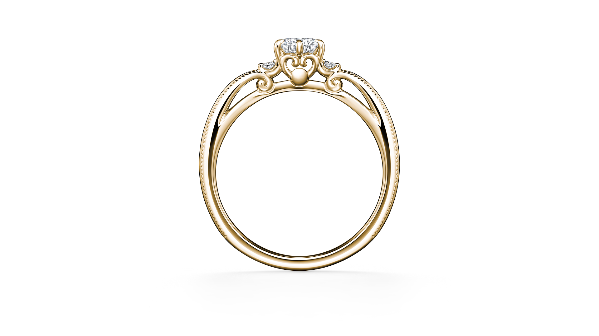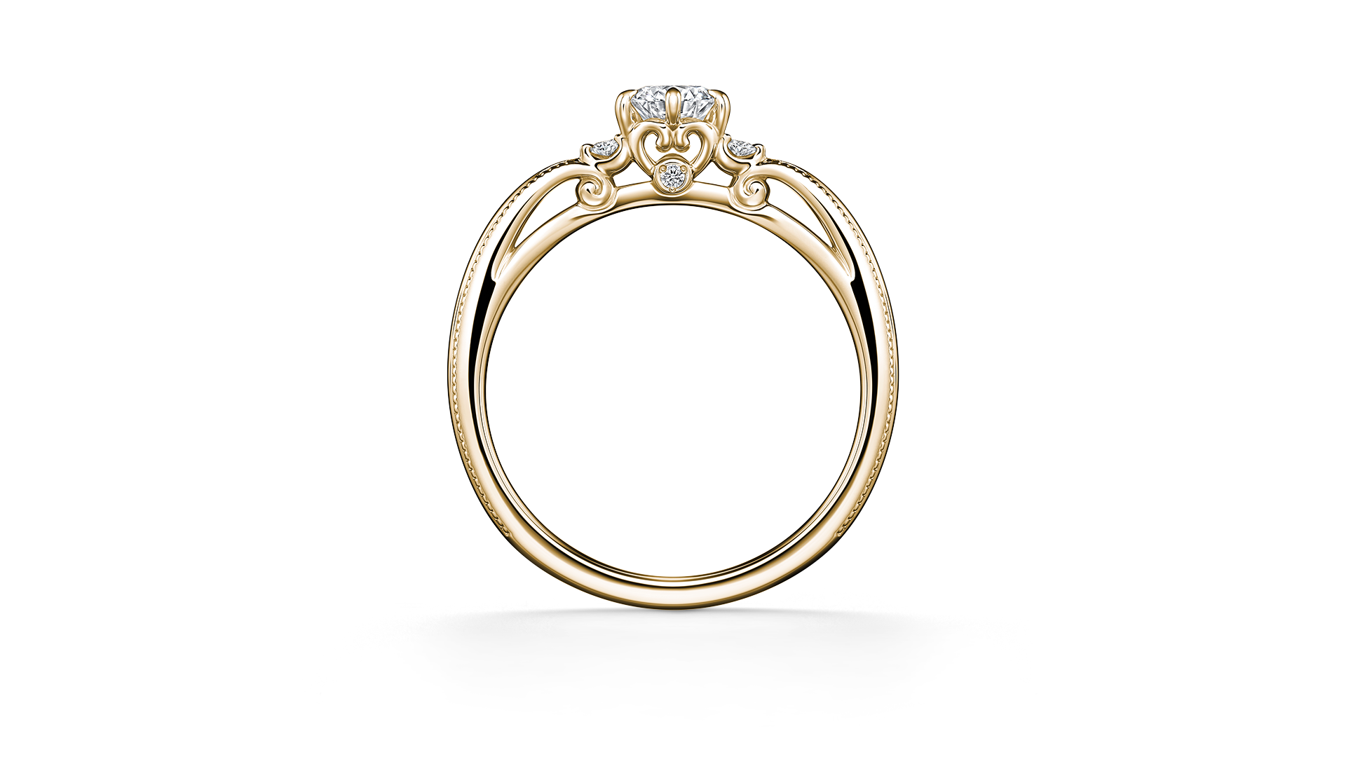 这款订婚钻戒的灵感来自夜空中格外耀眼的昴宿星团。两侧的滚珠装饰,宛如点点繁星绽放雅致光辉。从侧边观赏时,能发现隐藏的爱心设计。大量运用镂空工艺,打造出剔透轻盈的造型。考虑到与结婚对戒叠戴的效果,仅于单侧镶嵌小颗美钻。设计洋溢着浪漫气息,从任何角度都显得典雅优美。