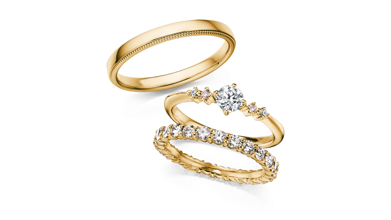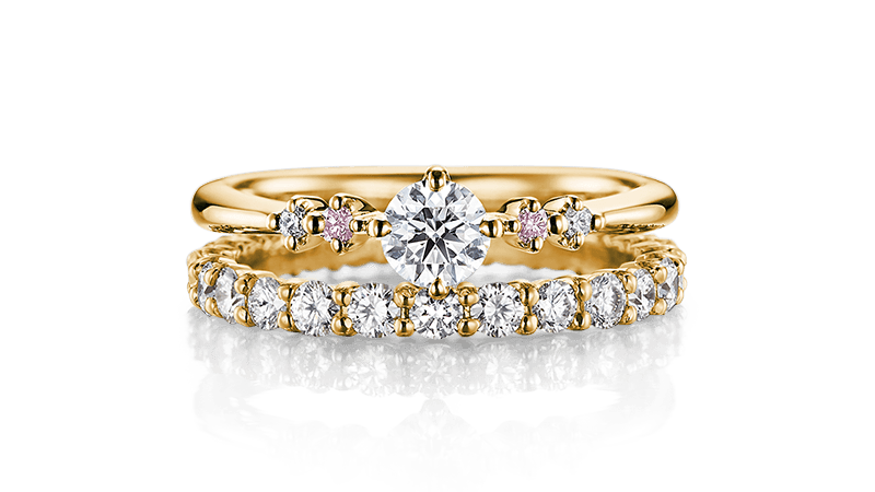 可爱的订婚钻戒「TWINKLE」,粉红色和白色的异色配钻闪闪发光。与玫瑰金的永恒之戒「MANI」搭配,成为华丽又浪漫的组合。