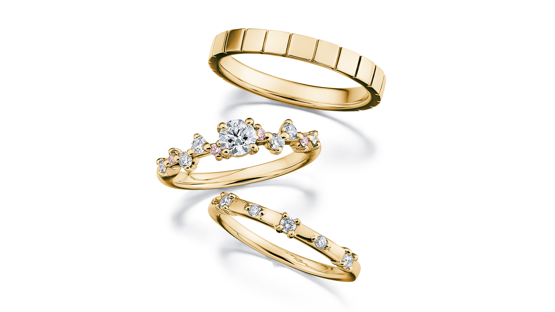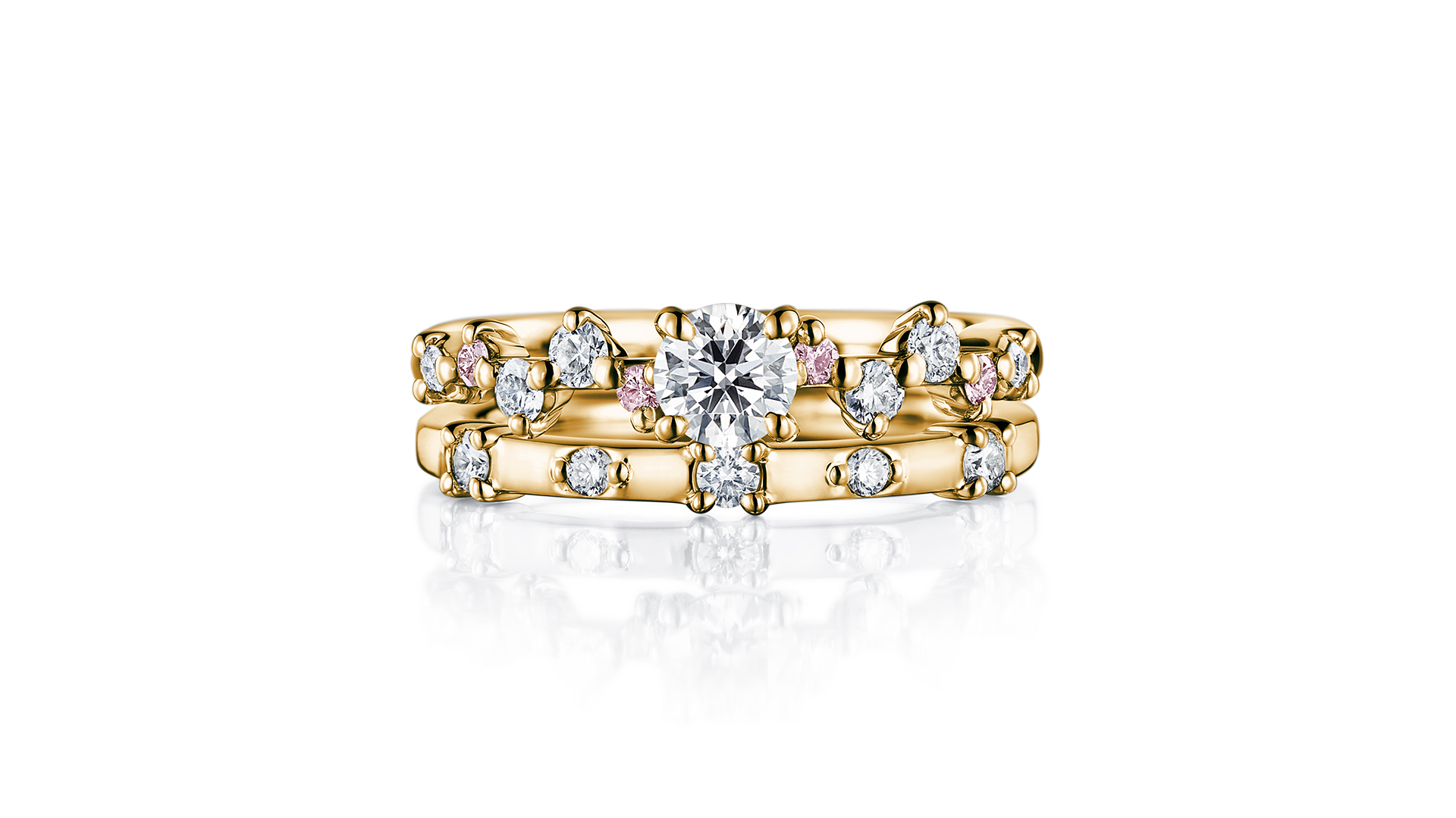 订婚钻戒以花环造型在指间甜蜜闪烁。 结婚对戒以果树之花的守护神为灵感,缔结情缘,开花结果。 ※粉红钻石为天然形成的矿石,图片颜色仅供参考,详细请洽各店铺服务人员。
