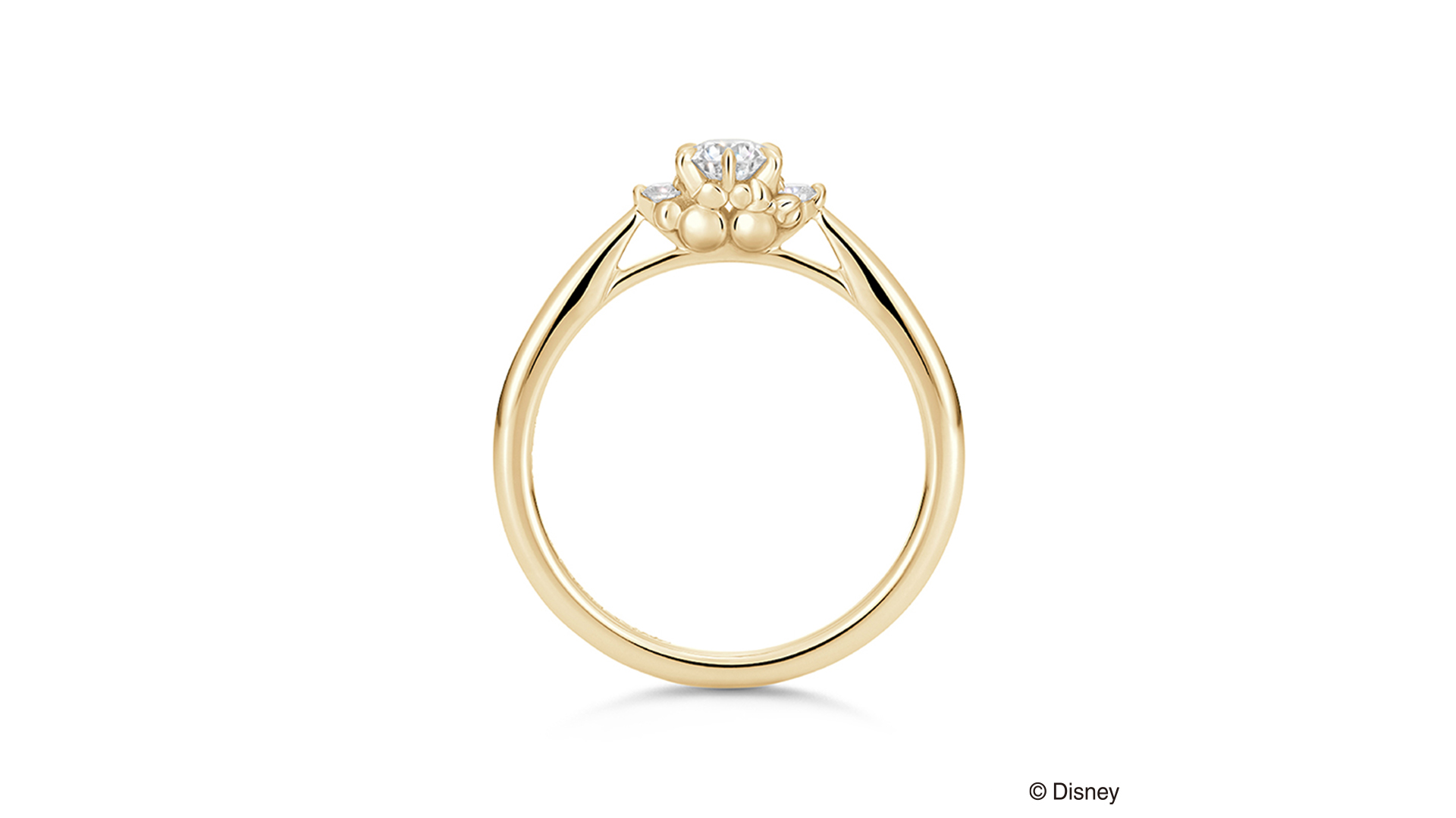 正面角度造型简单利落。两颗配钻依偎着主钻,为戒指增添惹人怜爱的印象。“米奇”与“米妮”设计成圆滚滚的立体形状,可爱到让人无法移开视线。