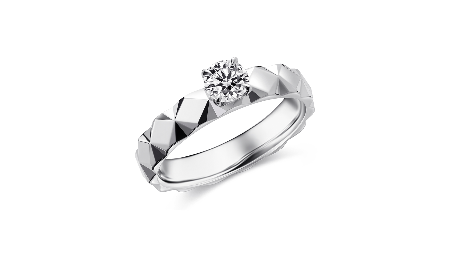 菱格切面的立体纹理,增强光线折射与反射。宽绰的戒壁轮廓强化了视觉张力。当光线掠过戒圈上菱格切面的纹理,仿佛极光在指间流转,见证每一次心动与誓言,成为永恒印记。