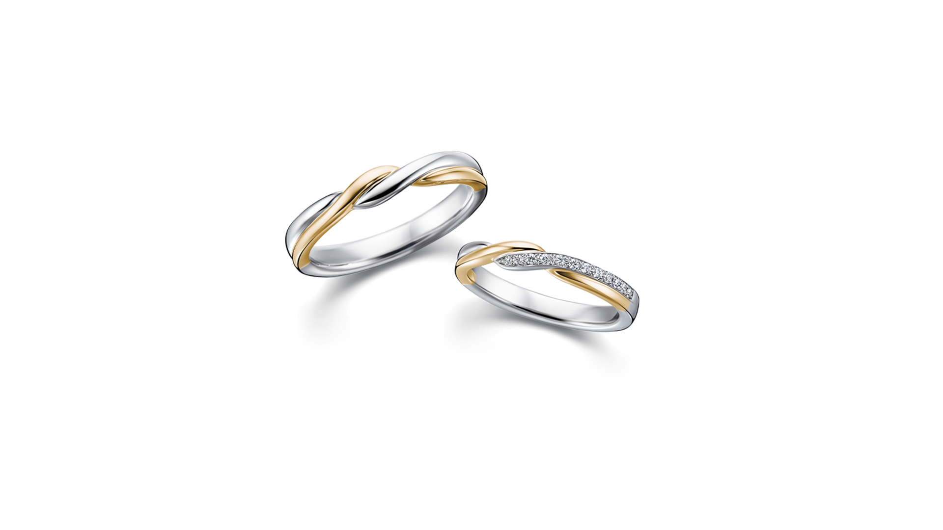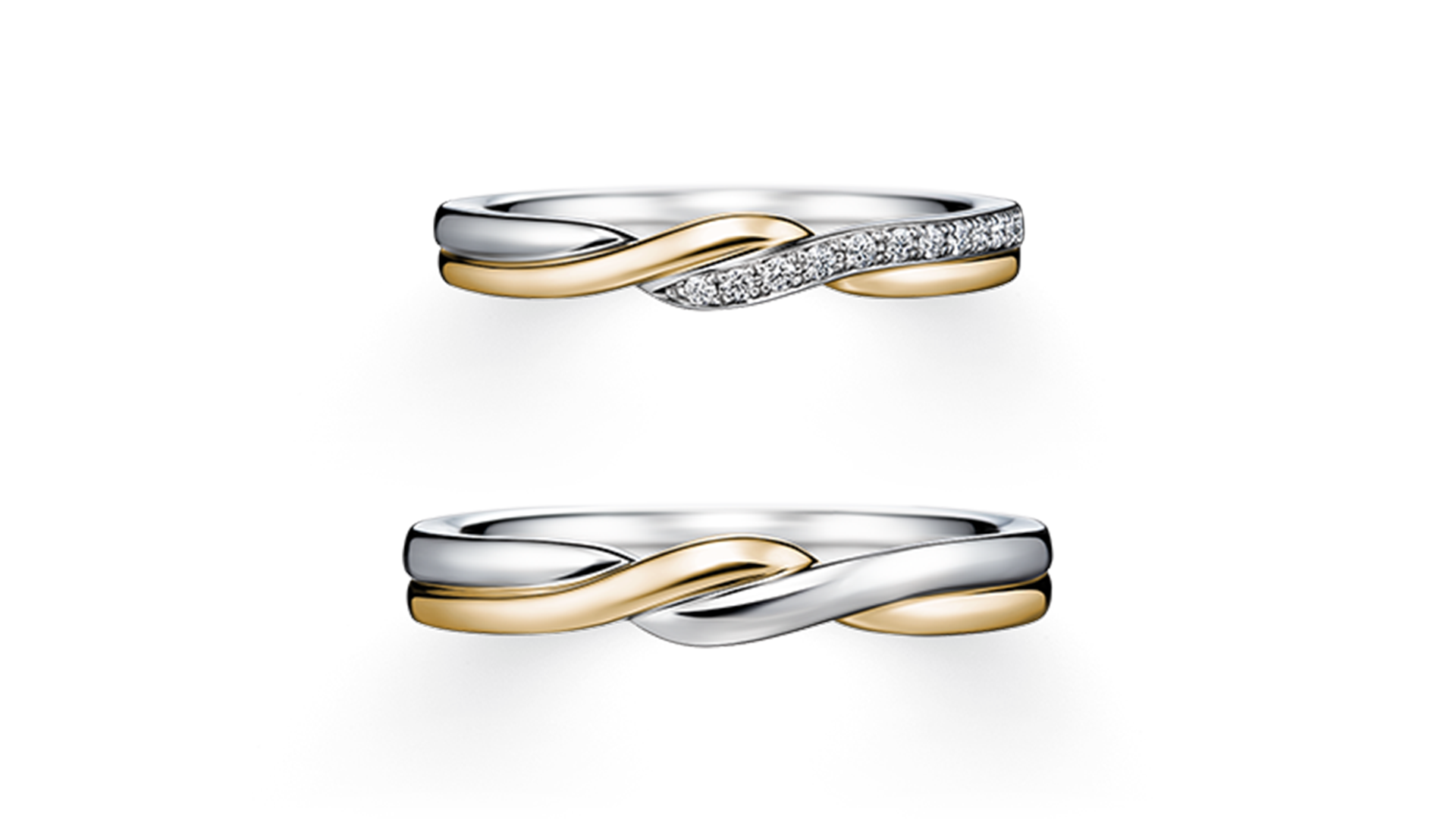 配钻与黄金线条互相交错的戒指,赋予指间优美魅力; 戒指厚实有分量,展现不容忽视的存在感。 直线型戒环上令人印象深刻的扭转造型与双色设计, 在手上散发高雅气质,祝福展开新生活的两人。