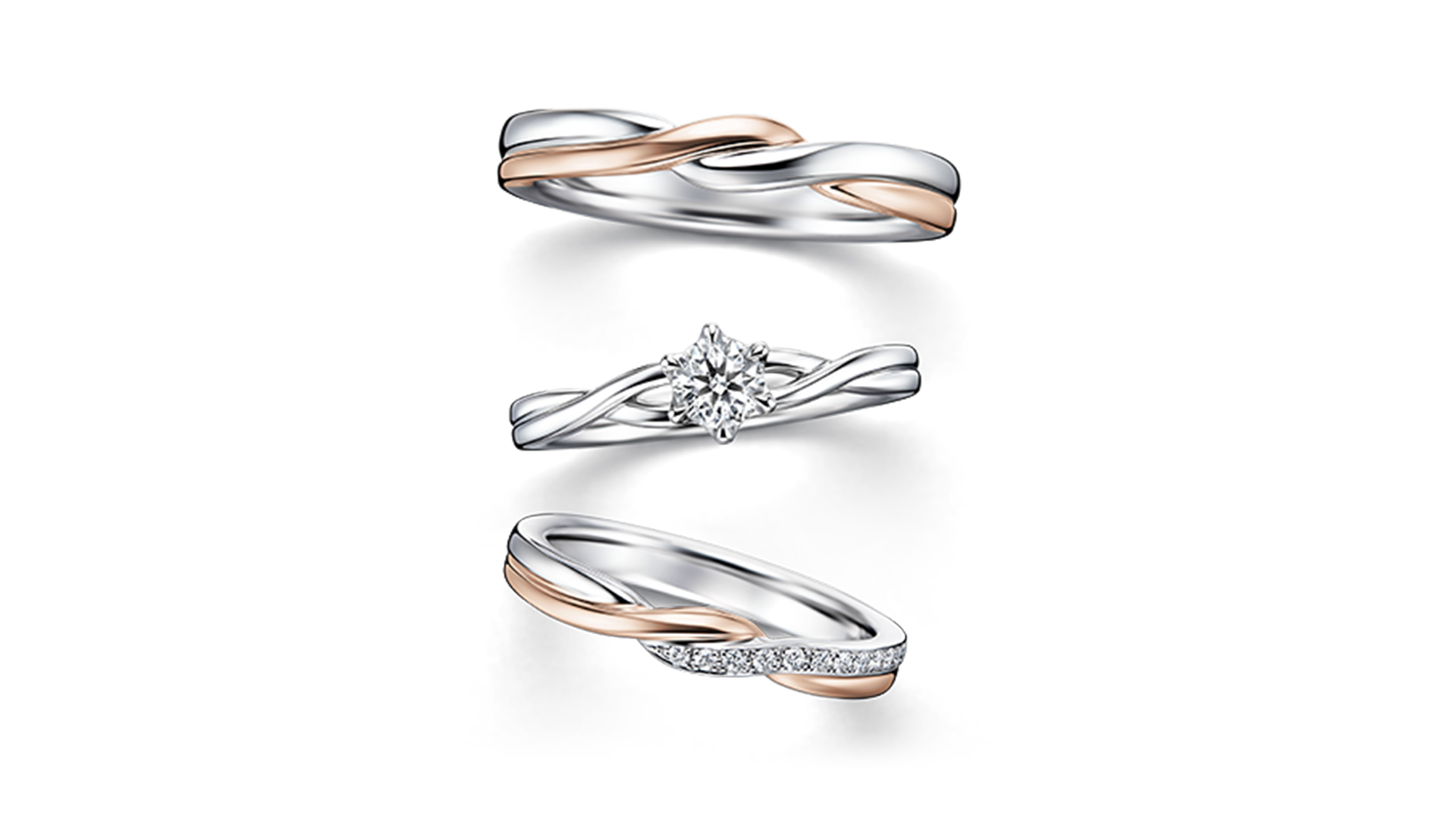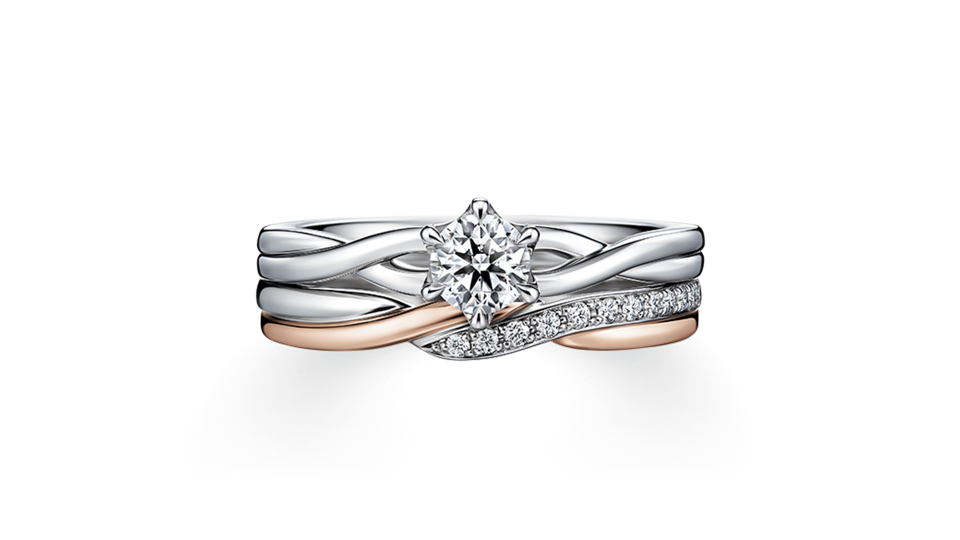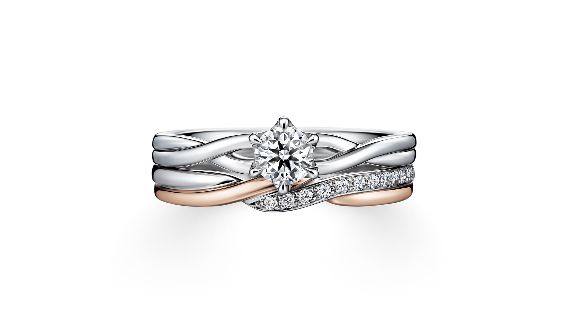 三款线条各异的戒指,以细致的扭转造型交织而成,宛如推动帆船的风,形成设计洗炼亮眼、风格华丽的套戒。