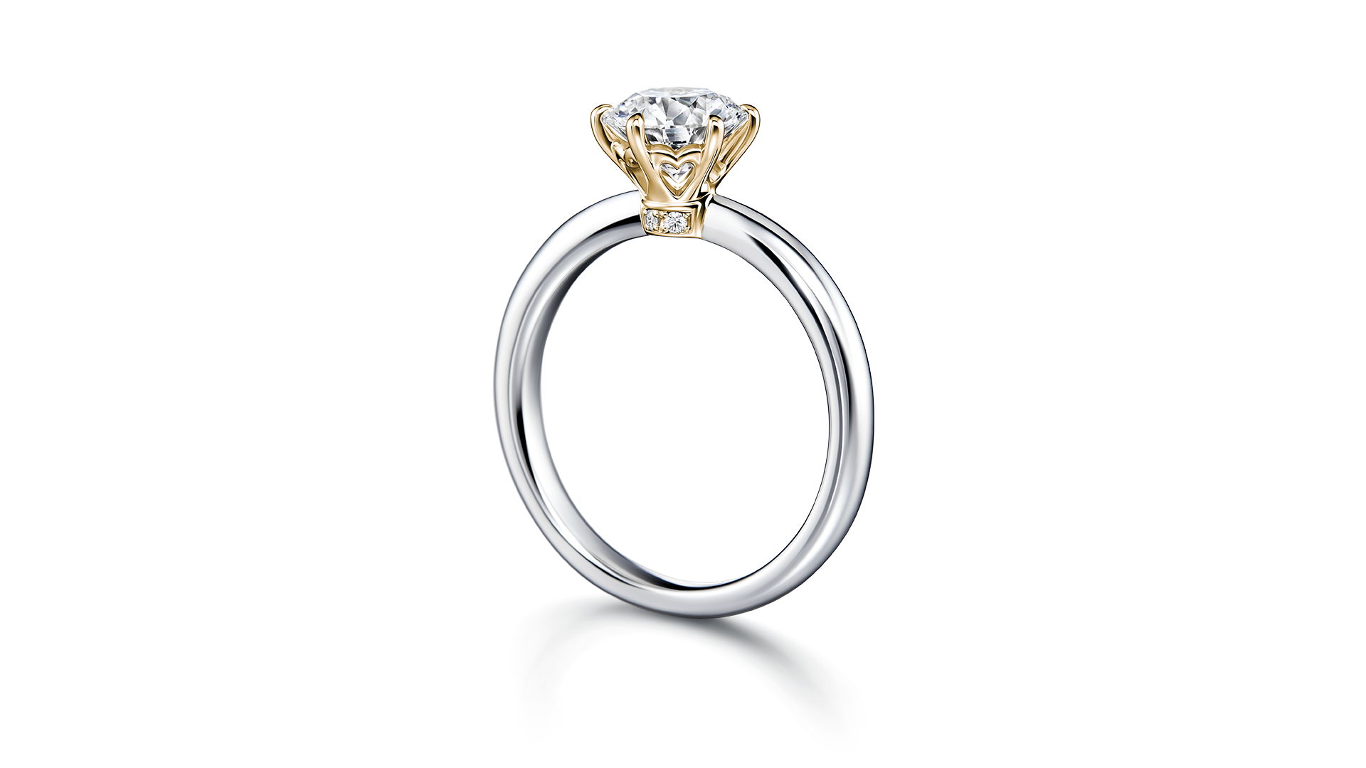 双色组合的单钻戒指上闪耀的一等星, 散发着不容忽视的华丽气质。 令人难忘的侧边设计,象征着两人的连接。