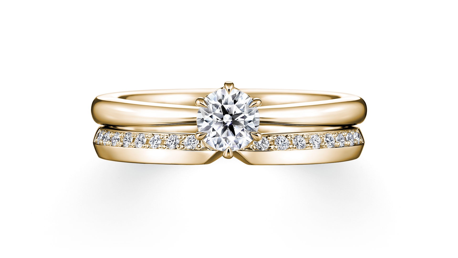 单钻戒指戴着如黄金王冠般的钻石,与戒环镶钻戒指完美重合,